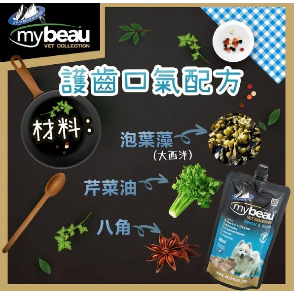 主要成份包括大西洋泡葉藻 (Ascophyllum Nodosum)、芹菜油和八角。成分被身體吸收後再透過血液及口水分泌循環到牙齒表面, 幫助抑制牙菌膜, 預防/軟化牙石及預防牙周病。同時從消化道及血液出發,徹底改善貓狗口氣問題。