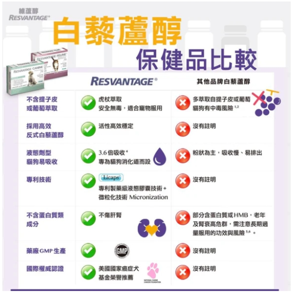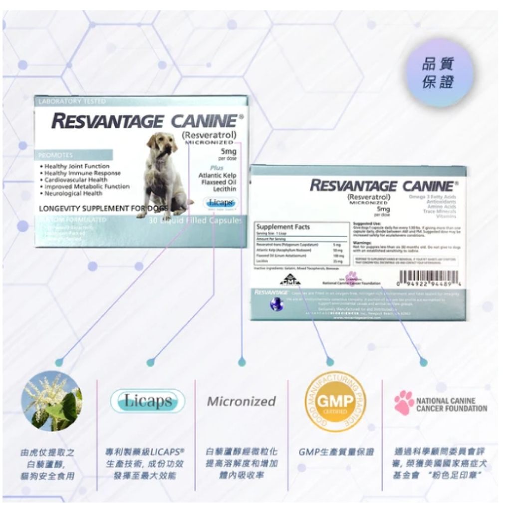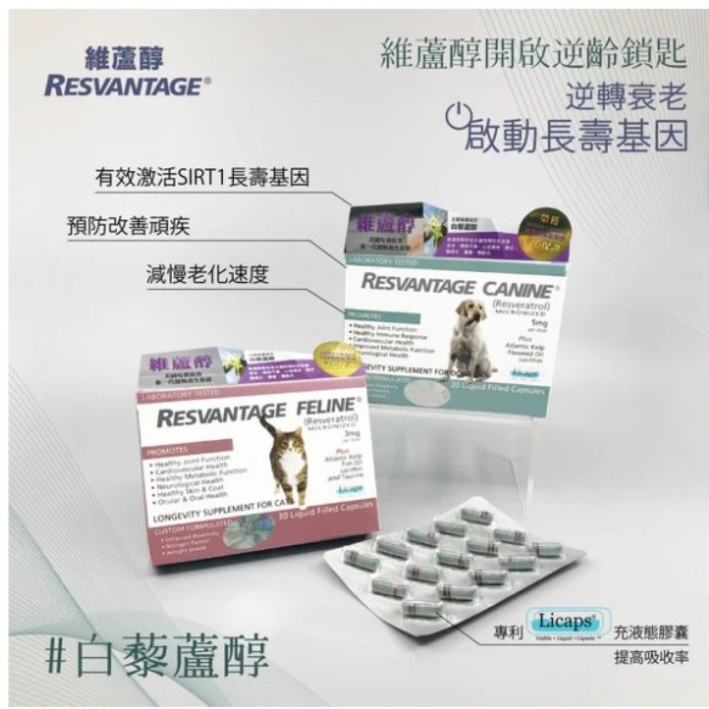 配方採用專利技術Licaps®精製,運用液體膠囊狀及微粒化技術,保證白藜蘆醇的穩定性及增加吸收率,特別針對寵物短小腸道而設。維蘆醇Resvantage®榮獲美國國家癌症犬基金會(National Canine Cancer Foundation)認證的唯一犬用白藜蘆醇產品。適合任何貓狗長期服用,逆轉新生。