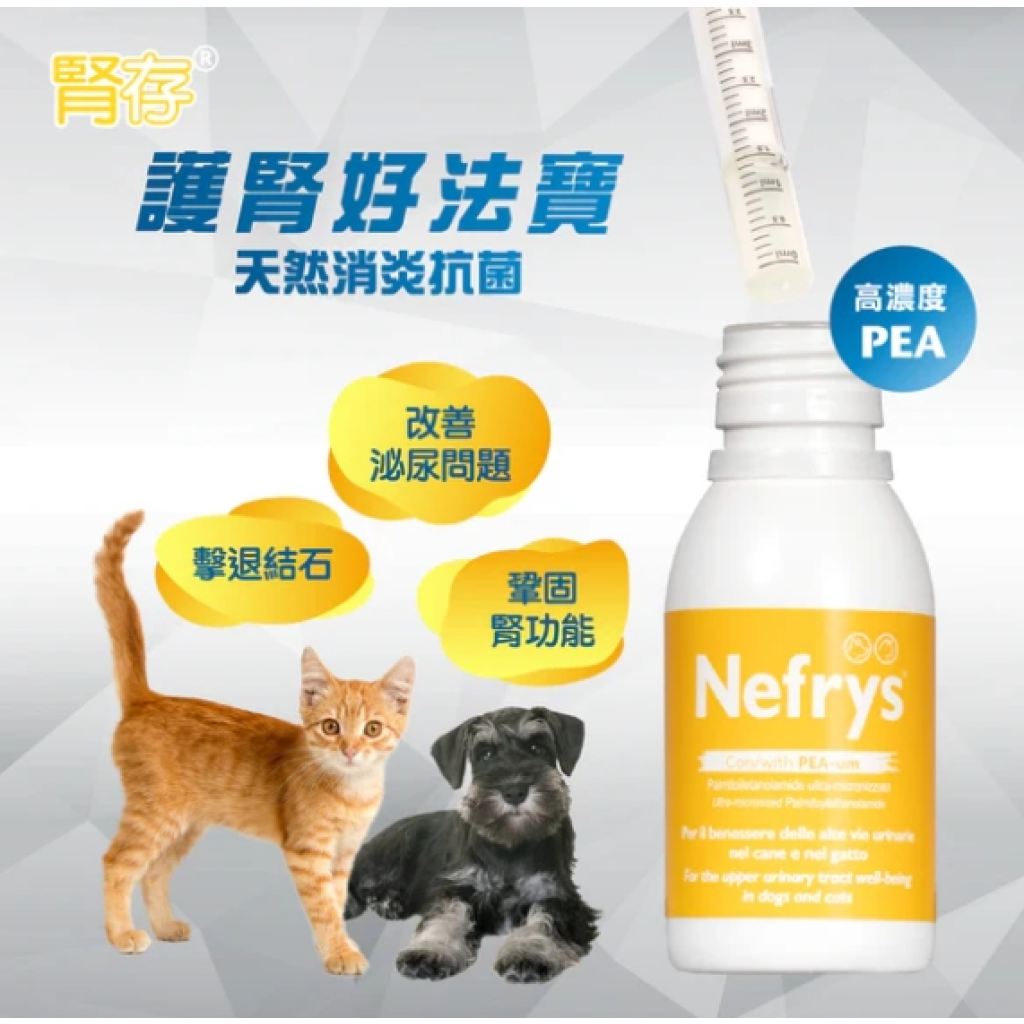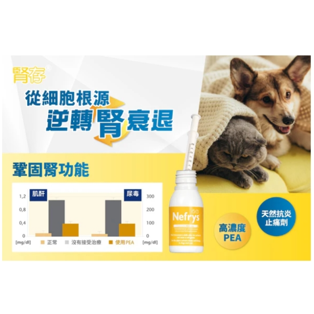 PEA更有助修復受損細胞組織(包括:腎小球和腎小管)。同時,亦減低血液裏的毒素含量(如:肌酐Creatinine及尿毒Urea),有效提升及鞏固腎臟過濾功能。液態配方主子身體更好吸收!成份全天然,不含藥性,適合任何階段的腎功能衰退、膀胱或尿道不適/發炎等症狀的貓狗服用。