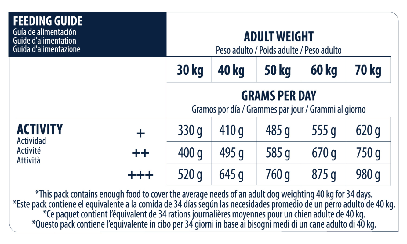雞肉(14%),玉米,小麥,玉米蛋白,脫水家禽蛋白質,大米(10%),玉米粉,玉米麩皮,動物脂肪,動物脂肪 (用天然生育酚混合穩定),甜菜渣,水解動物蛋白,魚油,氯化鉀,酵母,血漿蛋白(免疫球蛋白的天然來源 0.4%),二磷酸四鈉(0.25%),氨基葡萄糖(455 mg / kg),硫酸軟骨素(350 mg / kg),天然多酚化合物(0.01%)