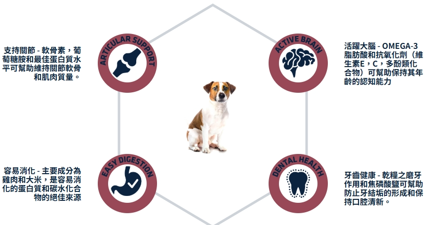其獨特的配方,有助於保護老年犬的關節軟骨,肌肉質量,維持其腸道及牙齒健康,並能改善其認知能力。