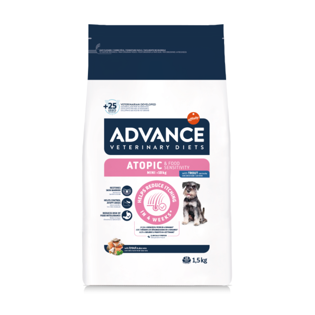 此外,ADVANCE VETERINARY DIETS以鱒魚和土豆為主要成分,有助於降低對食物可能產生不良反應的風險。ADVANCE VETERINARY DIETS ATOPIC MINI特別適合迷你犬的需要(小於10公斤)。