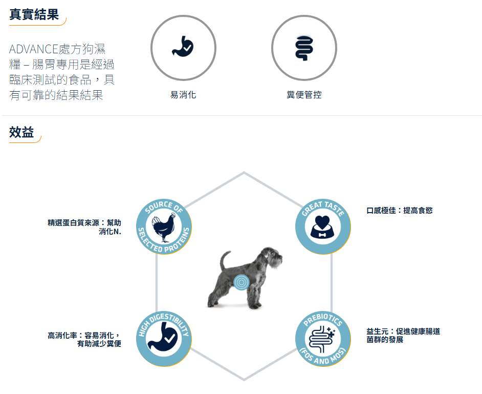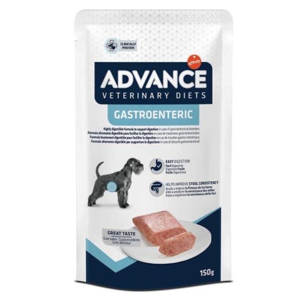 ADVANCE處方狗濕糧 – 腸胃專用是適合14週以上幼犬和成年犬的完整飲食產品,其成分高易消化,纖維含量低,並且鈉和鉀的比例增加,有助於緩解某些胃腸道疾病,並在外分泌性胰腺功能不全的情況下提供幫助。
