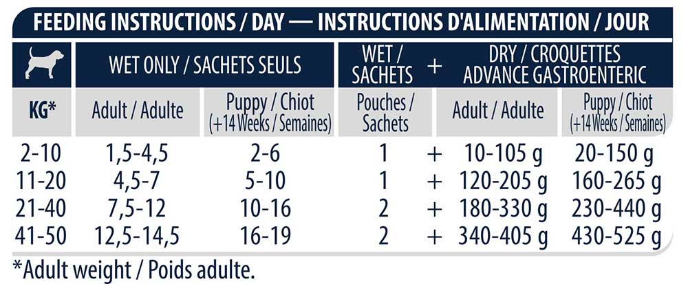| ADULT WEIGHT | ADULT Pouches/day | PUPPY > 14 WEEKS Pouches/day |