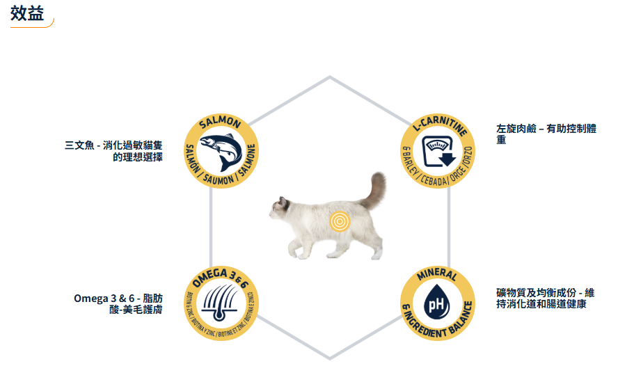 其三文魚的配方,非常適合過敏的貓貓,易於消化並有助於腸道健康。它還有助於控制成年貓於絕育後的體重。