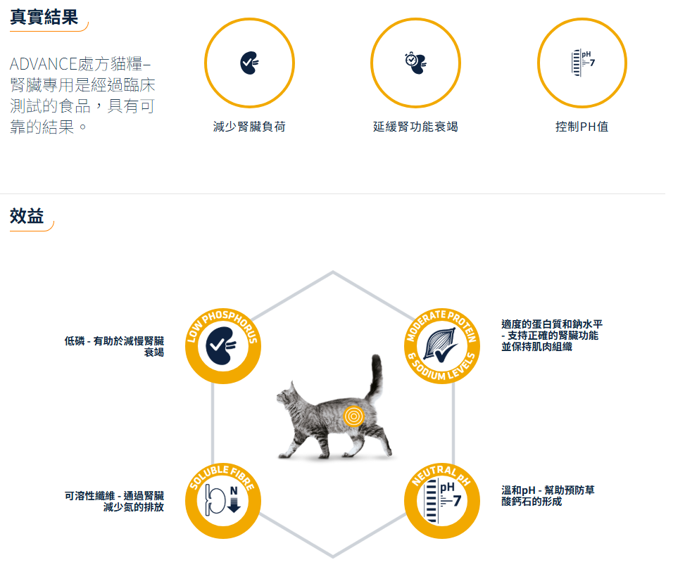 ADVANCE處方貓糧–腎臟專用是成年貓的完整飲食產品,蛋白質含量有限,但質量高,磷含量低,特別推薦用於在慢性腎臟疾病的情況下支持貓的腎臟系統功能。此外,它有助於防止草酸鈣石結石的形成,並保持貓的肌肉系統