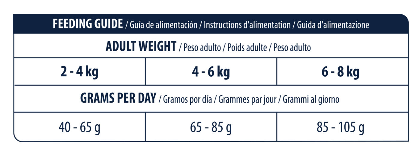 雞肉、大米、脫水家禽蛋白、玉米蛋白、玉米粉、動物脂肪、水解動物蛋白、魚油、鹽、氯化鉀、甜菜漿、低聚果糖、魚肽(0.1%)、蜜蜂花提取物(0.1%)、檸檬酸鉀、氨基葡萄糖(400 mg/kg)、硫酸軟骨素(100 mg/kg)、尿液酸化物質:玉米蛋白、氯化銨、蛋氨酸 - 營養指標