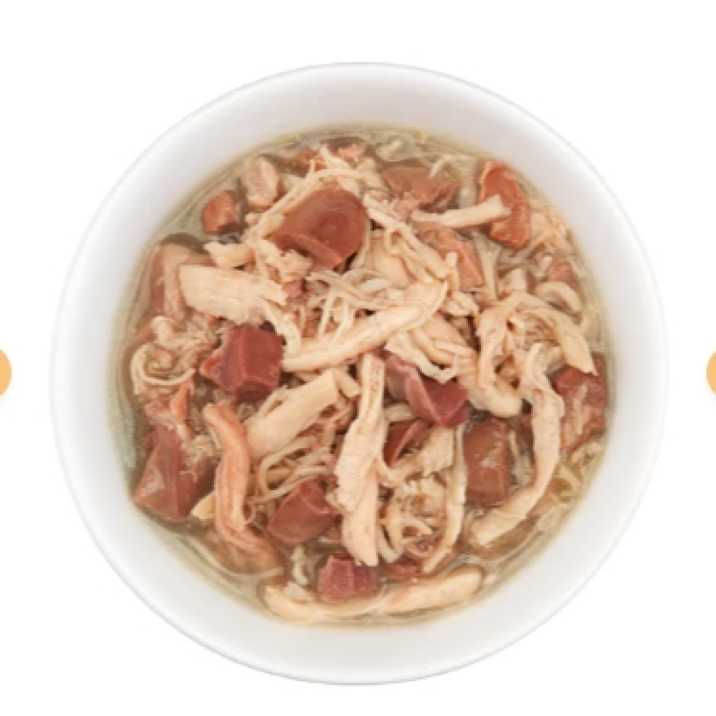 雞肉 60%(雞胗 5%、雞肝 5%、雞心 5%)、雞湯 29%、鴨肉 6%、精製葵花籽油、木薯澱粉、礦物質。