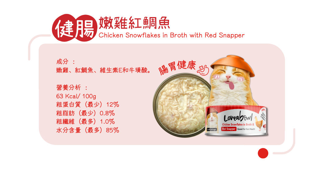 產品成分:- 嫩雞、紅鯛魚、維生素 E 和牛磺酸。