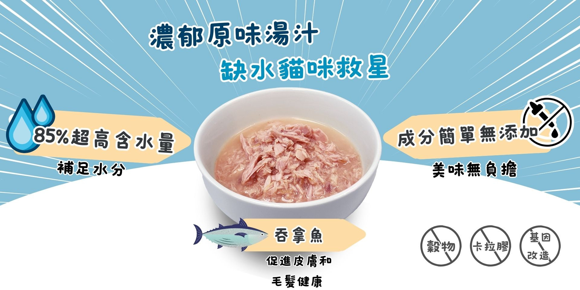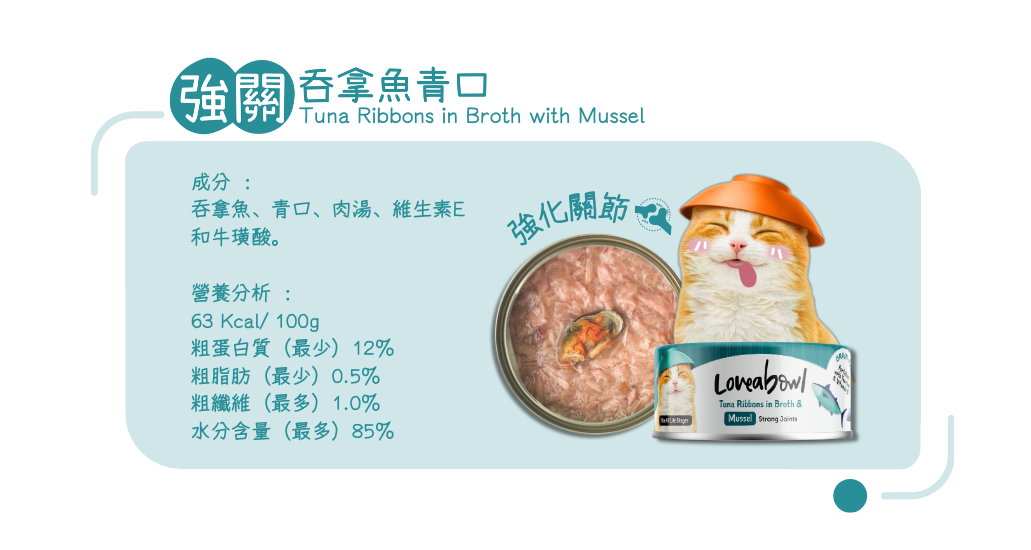 青口是天然的關節補充品,配上吞拿魚,有助強化貓咪關節,降低患關節炎