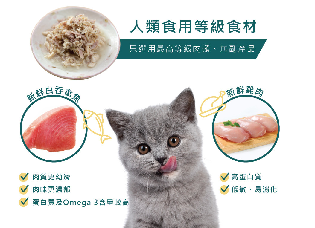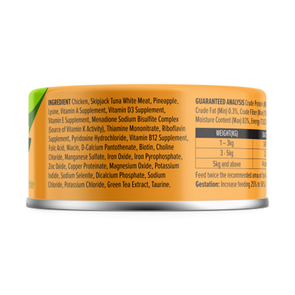 雞肉,白吞拿魚,菠蘿,離胺酸,維生素 A 補充劑,維生素