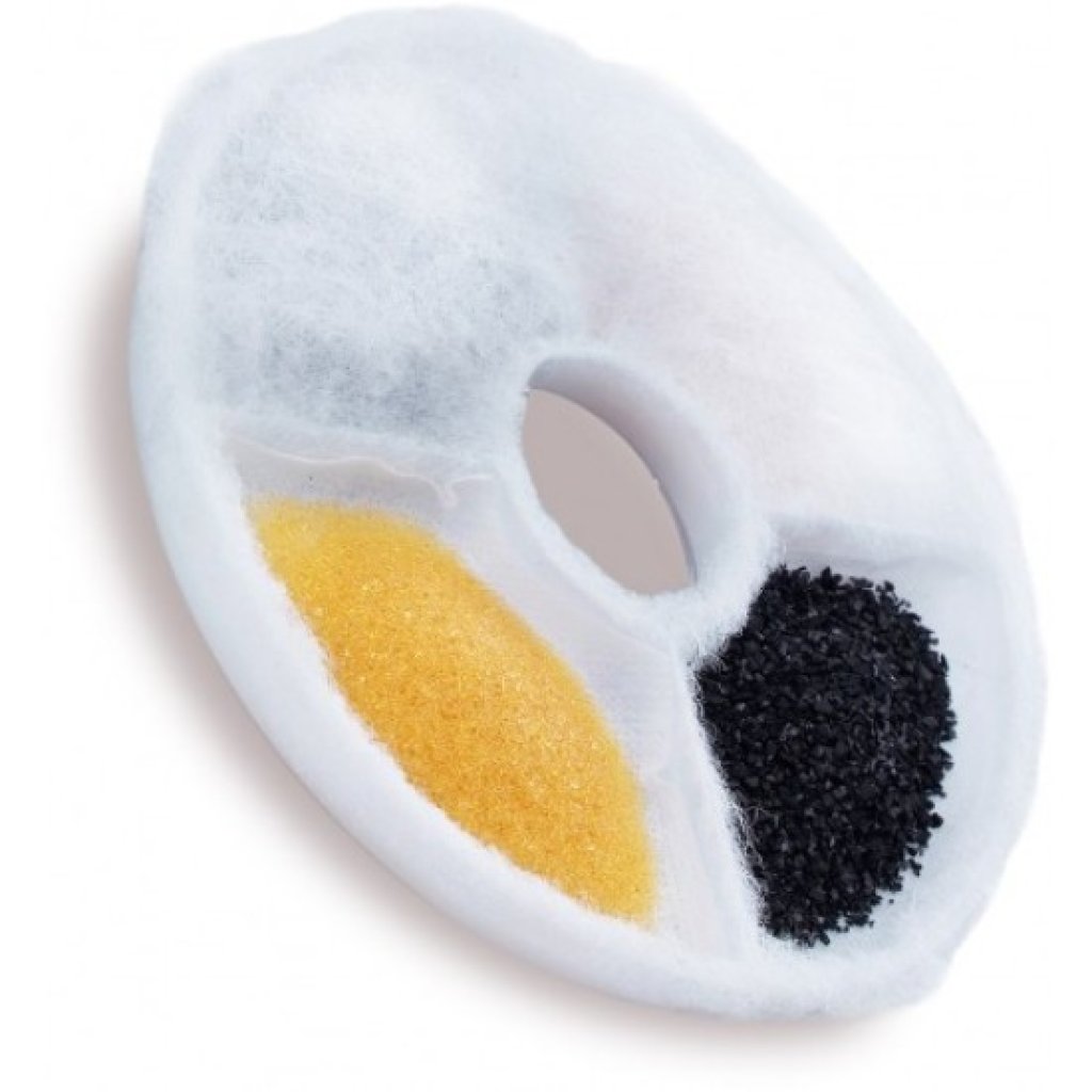 離子過濾棉,採用離子交換樹脂和高性能活性碳製作而成,離子交換樹脂能夠軟化自來水中鎂和鈣的硬度,形成適合寵物飲用的水質。純天然的高性能活性碳,能夠吸附自來水中氨的味道和殘留物,不織布層有效去除灰塵和雜質,為寵物提供乾淨的水,從而達到維持狗狗尿路健康的作用。2片裝,每次更換1片,建議3周至1個月更換一片
