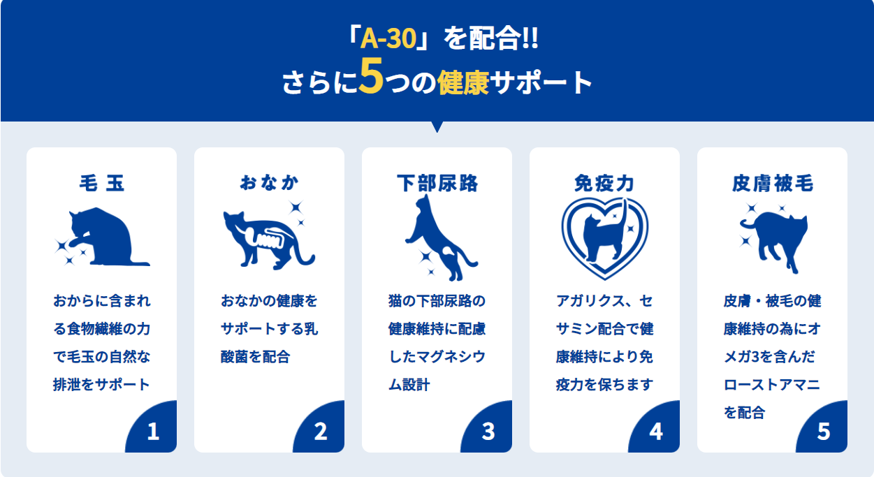 含有氨基酸“A-30”的綜合營養食品,支持貓的健康維護。