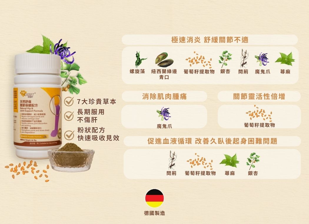 葡萄糖胺、軟骨素組成貓關節軟骨的重要成份,有助於改善貓貓關節炎症狀,幫助舒緩痛楚。