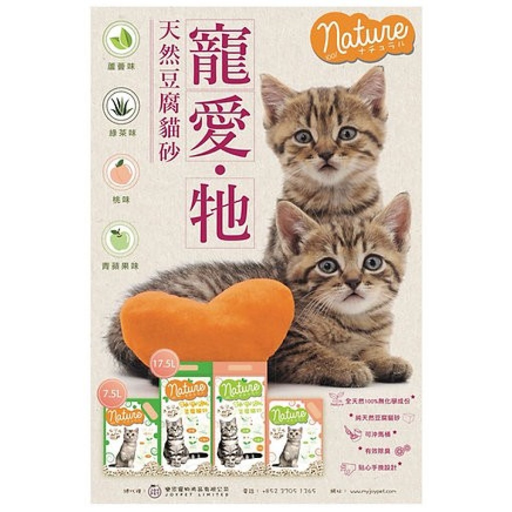 NATURE 豆腐貓砂,材質天然、 無粉塵而且凝結效果極好。使用過的砂可直接沖走或埋進土裡作肥料之用,十分環保。